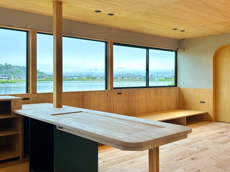 湖に向かって大きく開かれた窓から、丸亀城まで望める絶景が広がります。