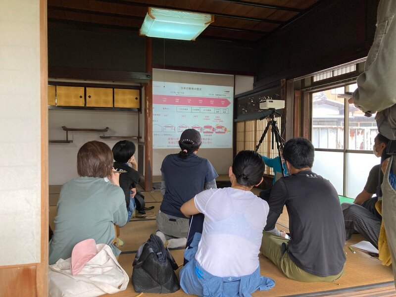 座学では、断熱と気密についての学びからはじまり、材料による断熱性能の比較、そして日本の断熱の歴史や政策から紐解きながら、時代別の中古物件の断熱性能の違いについて学びます。