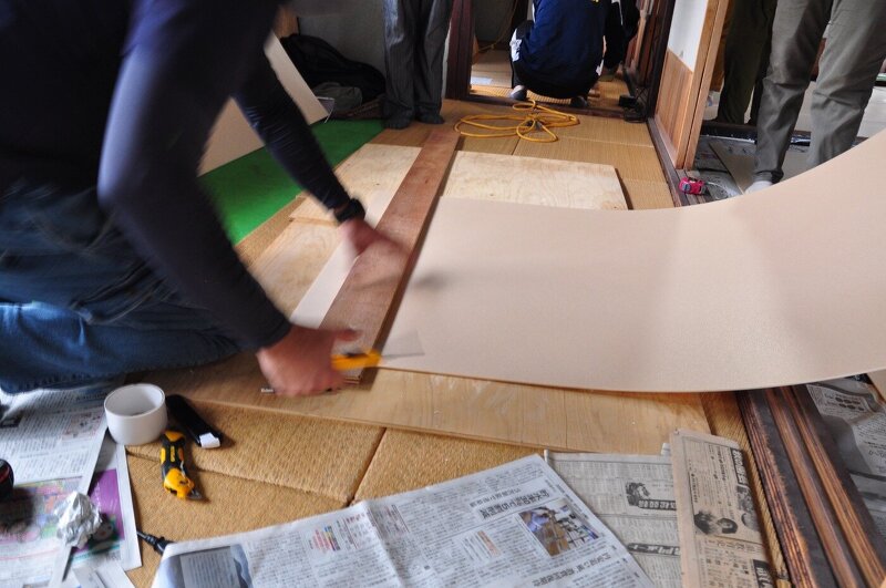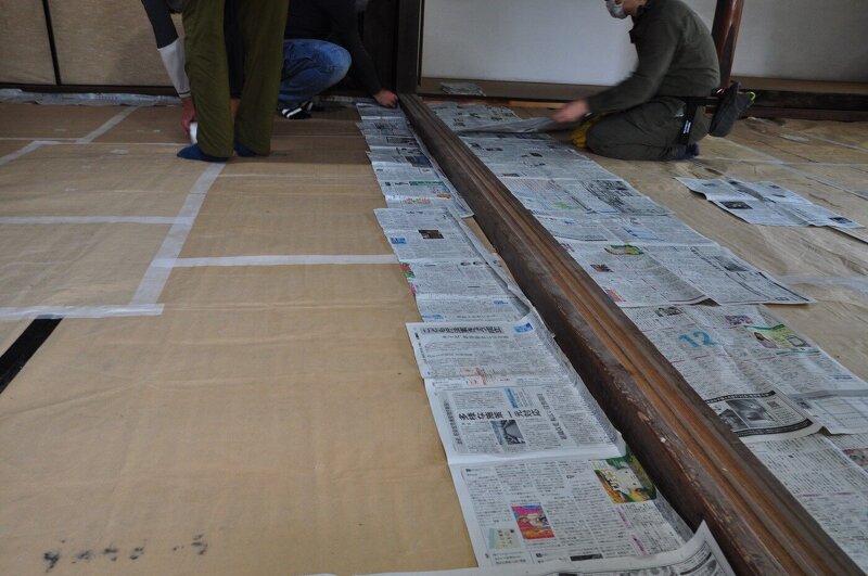 気密を取るためには、畳の床下地の板の隙間から外気が通り抜けないように、新聞紙と気密テープで目張りをしていきます。特に畳と敷居が接する部分から床下の外気が入ってきやすいため、敷居まわりは入念に気密テープを張り上げていきます。