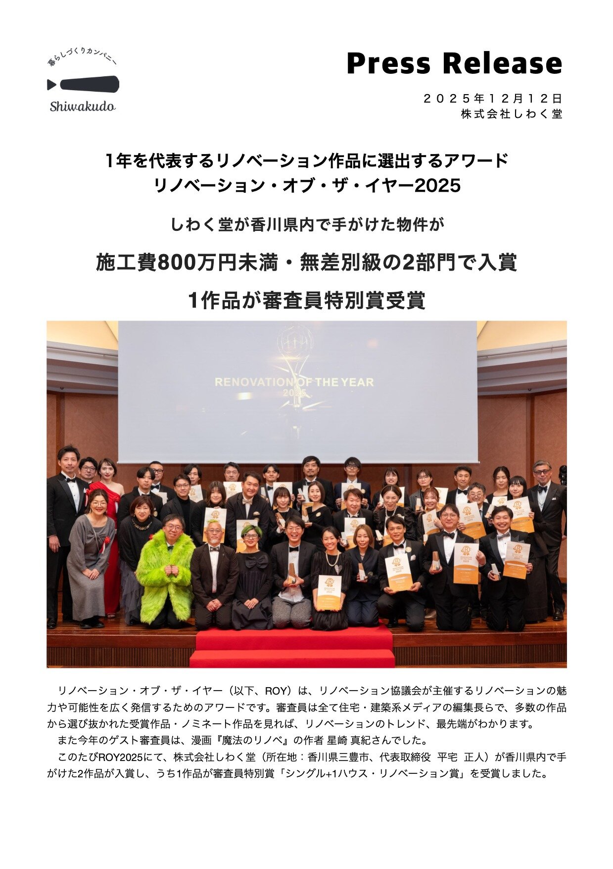 リノベーション・オブ・ザ・イヤー20252部門で入賞 1作品が審査員特別賞受賞