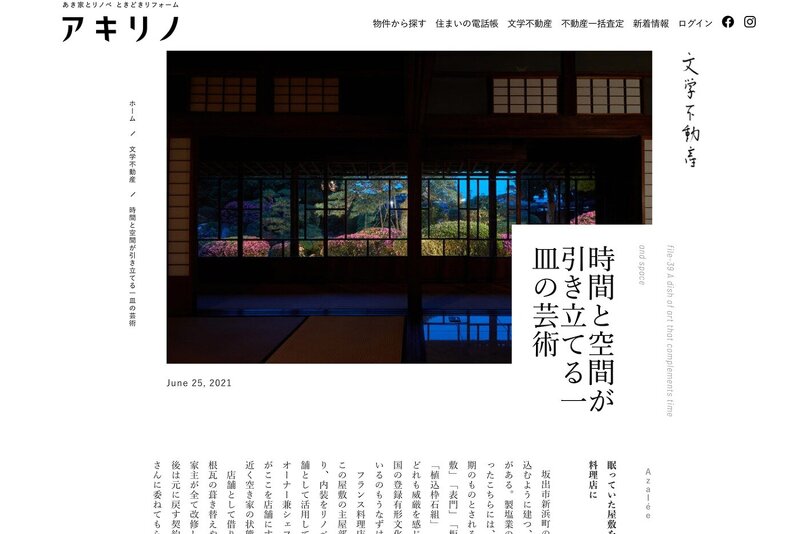 2021年06月28日(月) PUBLICATION メディア掲載WEBメディア「文学不動産」| Azalée 空き家ポータルサイト「あき家とリノベ ときどきリフォーム」が運営するWEBメディア「文学不動産」に庭園のライティングデザインを手がけました「Azalée」が掲載されました。