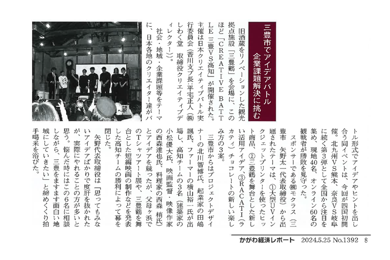 2024年06月19日(水) PUBLICATION メディア掲載「かがわ経済レポート」2024/5月号| しわく堂 新時代の鼓動を応援する報道誌「かがわ経済レポート」にしわく堂が手がけた ・たかた内科医院 ・CREATIVE BATTLE 三豊VS高知 が掲載されました。 かがわ経済レポートHP たかた内科医院 CREATIVE BATTLE 三豊VS高知