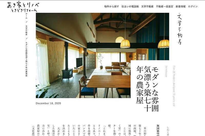 2020年12月24日(木) PUBLICATION メディア掲載WEBメディア「文学不動産」| ブンカノーカ 空き家ポータルサイト「あき家とリノベ ときどきリフォーム」が運営するWEBメディア「文学不動産」に「ブンカノーカ」が掲載されました。