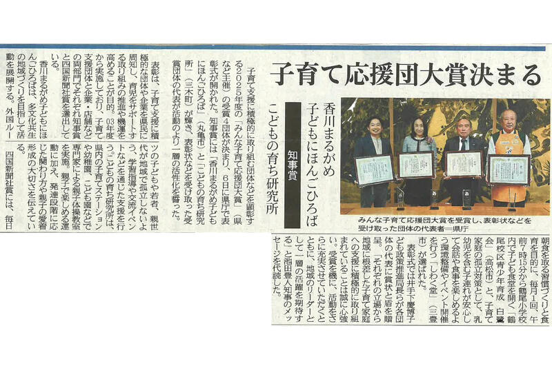 2026年03月23日(月) PUBLICATION NEW メディア掲載四国新聞に掲載されました しわく堂が運営する飲食店「おむすび座」が子育て応援団の四国新聞社賞を受賞したことについての記事が四国新聞に掲載されました。 「四国新聞」の掲載記事はこちら