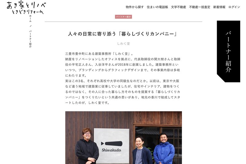 2020年12月18日(金) PUBLICATION メディア掲載あき家ポータルサイト「あき家とリノベ ときどきリフォーム」 あき家探しポータルサイト「あき家とリノベ ときどきリフォーム」にて、パートナーとしてしわく堂を紹介いただきました。