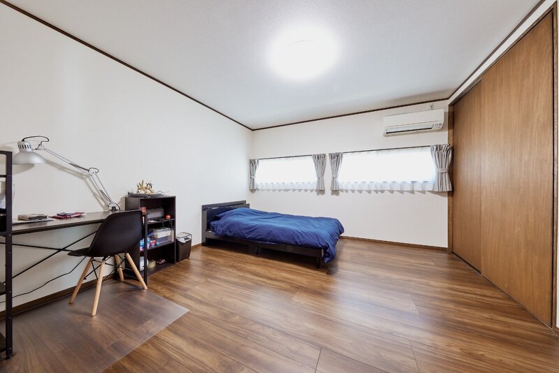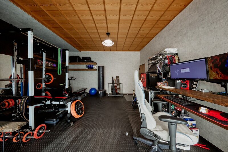 多趣味の旦那様の部屋はトレーニング用品や音楽関係の機器がたくさん!籠って趣味に没頭できます。奥さまは夜勤もあり、一人でゆっくり寛げるスペースをご希望でした。フカフカの絨毯を敷き詰めた空間で、大好きな本やDVDを観て日々のストレスが癒される空間をご提案。ちょうど一人分の空間は、手を伸ばすと届く距離にお気に入りのモノや必要なモノが配置できます。