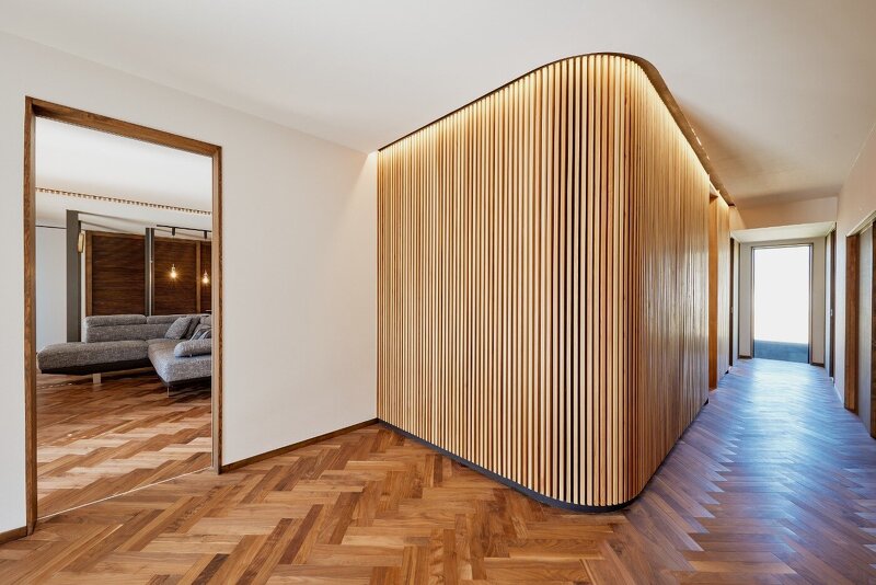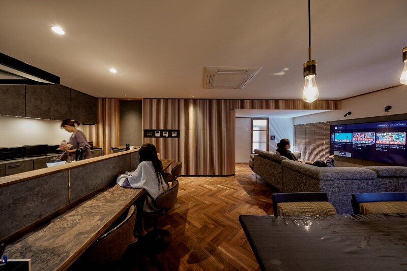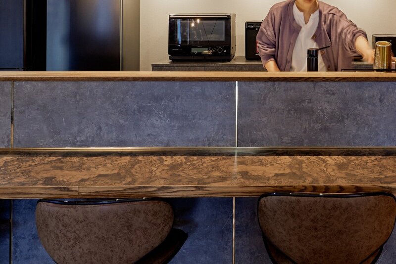 小さなピースの集合体は床でも表現。ウォルナット無垢材のヘリンボーン貼りは高級感があります。