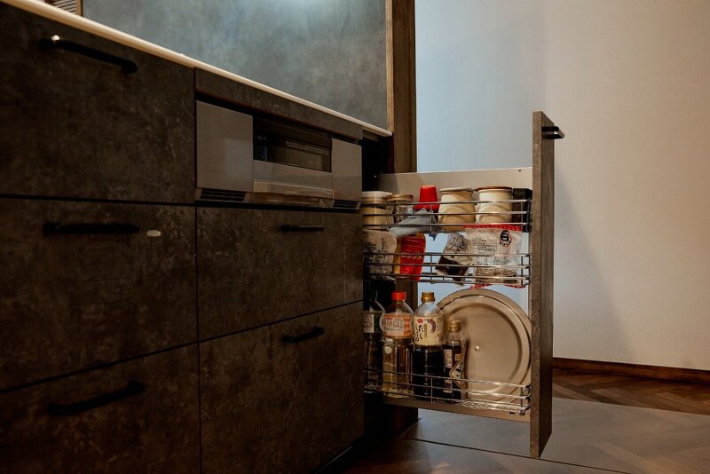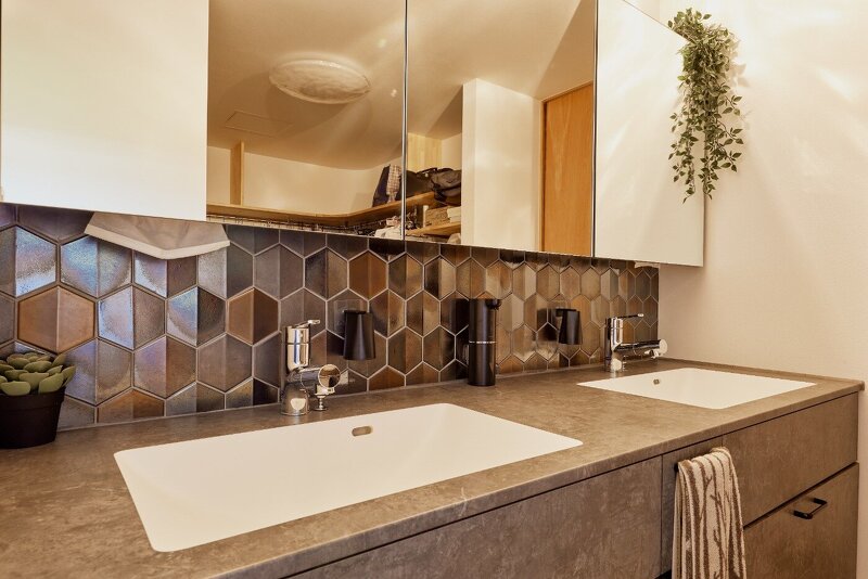 洗面化粧台やキッチンは使い方や収納するものにフィットする設計。造り付けだからこそできる痒いところに手が届く仕様が叶います。見た目だけのデザインではなく、使いやすさ、暮らしやすさを追求し細部までこだわった計画です。