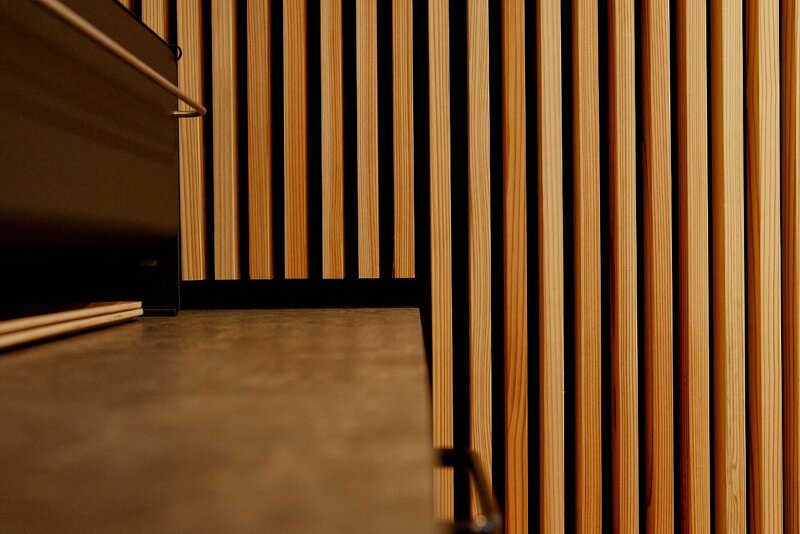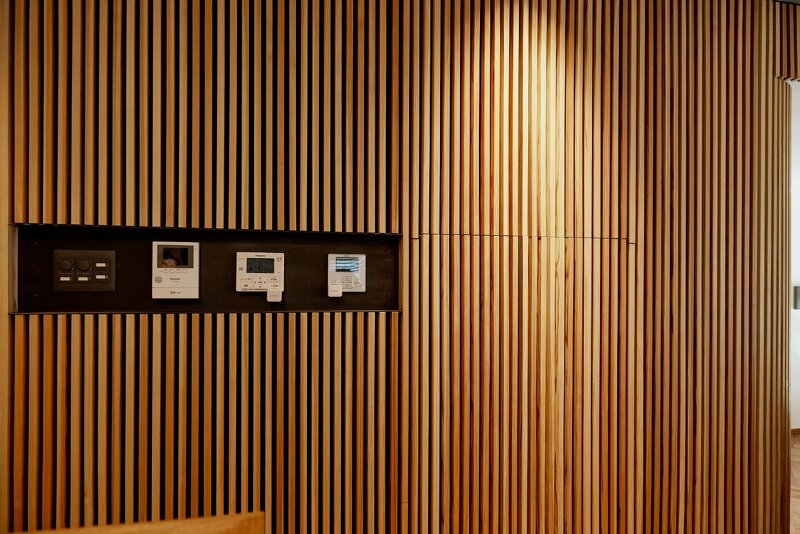 センターコアをぐるりと囲う杉材の縦格子は、玄関からリビングの象徴的なフォーカルポイント。コンセプトとなる小さなピースの集合体を表します。