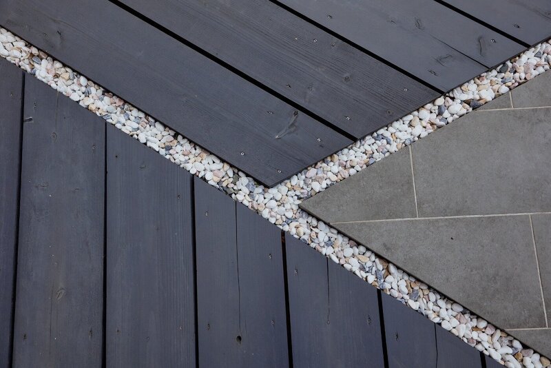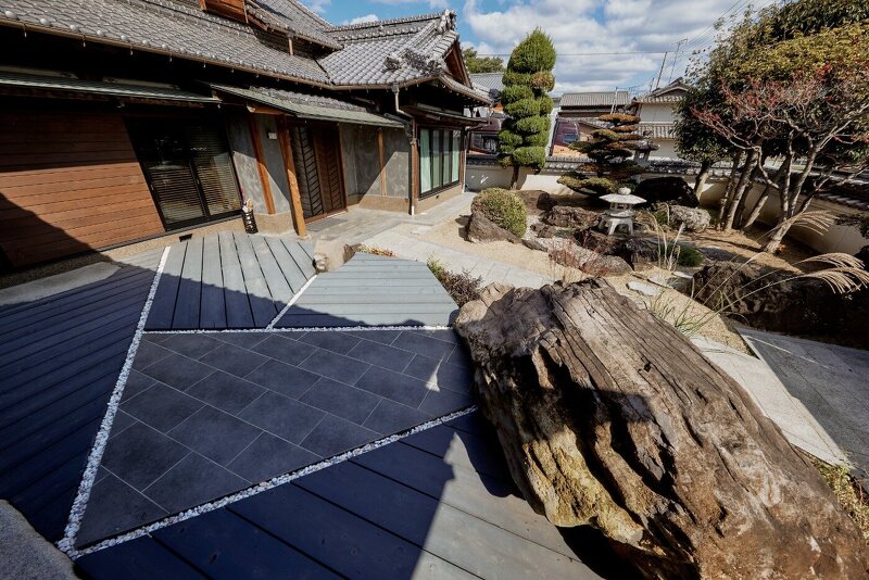 ウッドデッキも小さなピースを敷き合わせました。バーベキュー用に中心部は掃除のしやすい石張りとし、日本庭園との調和が取れるように目地に玉砂利を入れています。