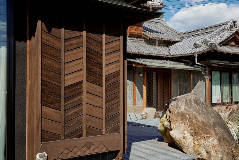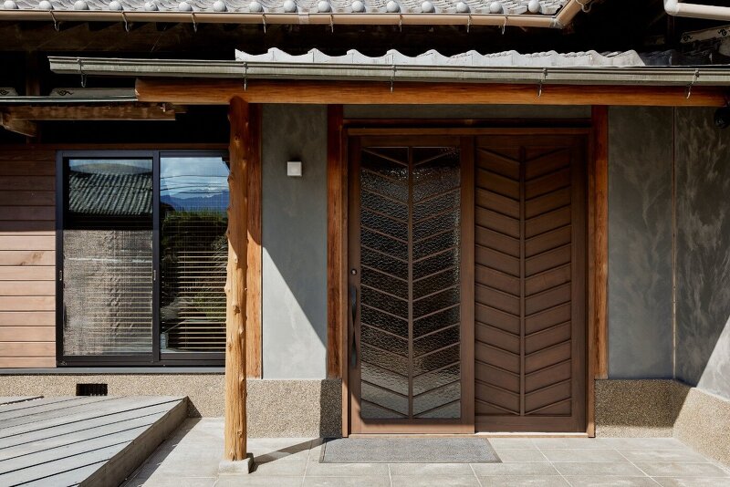 既存雨戸の矢羽根模様のディティールをそのまま玄関ドアに利用。矢羽根模様は魔をはらう意味もあり、さらには「的を射る」など、縁起の良い模様です。新調した建具ですが新しくなり過ぎないちょうどいい塩梅で、お客様をお迎えできます。