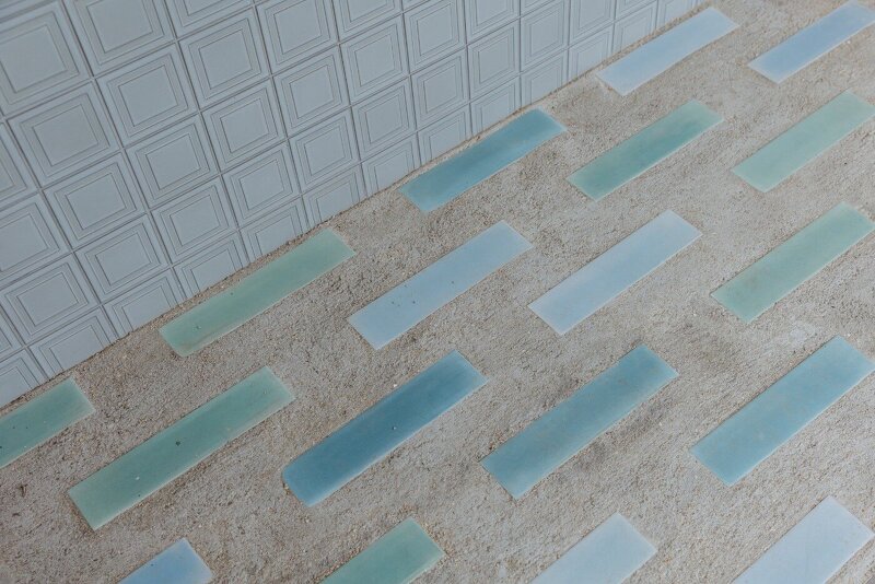 店内床面に荒く並べたタイルフロア