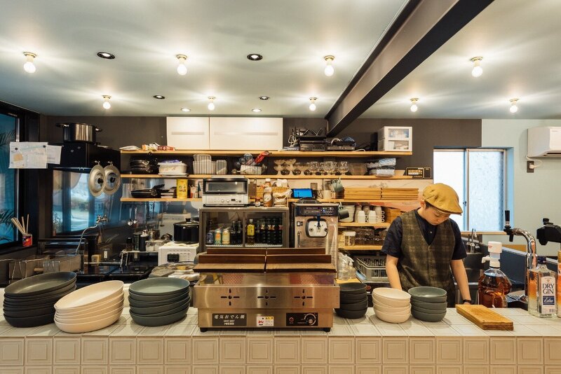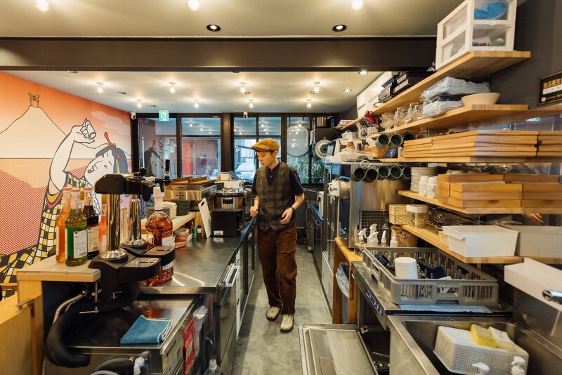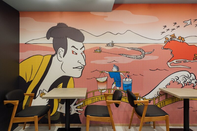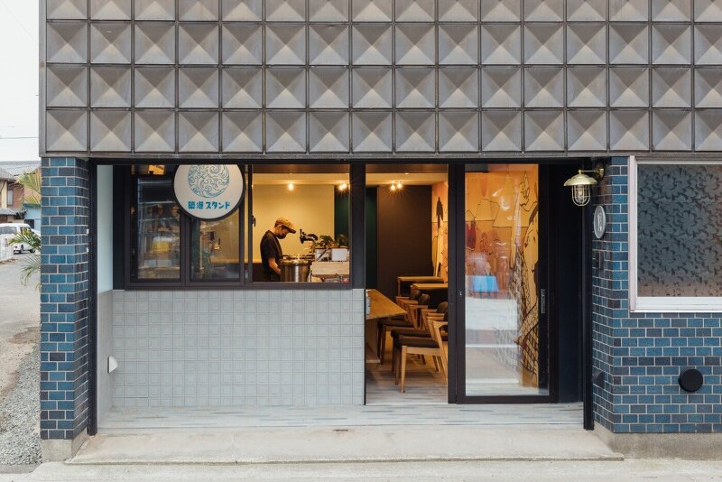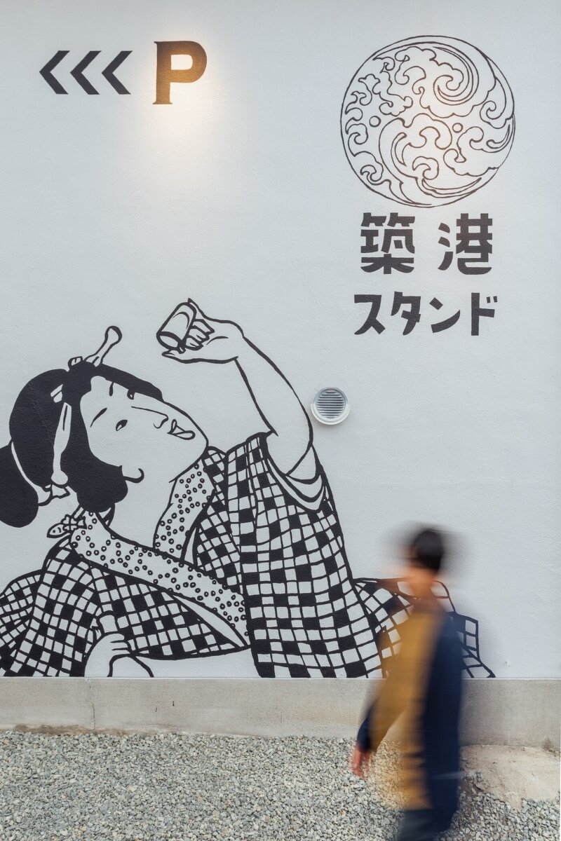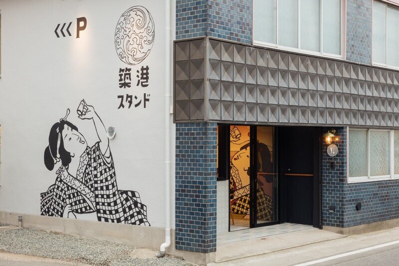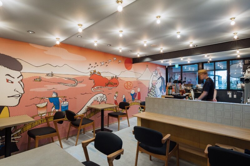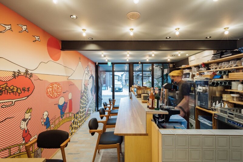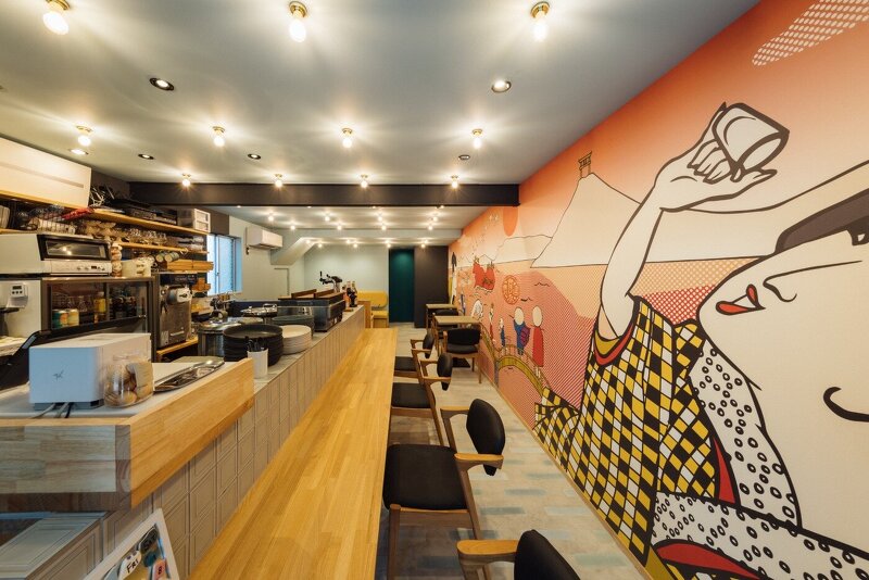 スタンドは、内外壁面にあしらった村山幸さんが手がけた観音寺市のアイコニックな光景がならぶ浮世絵風の躍動感あるイラストレーションが店内へ誘います。