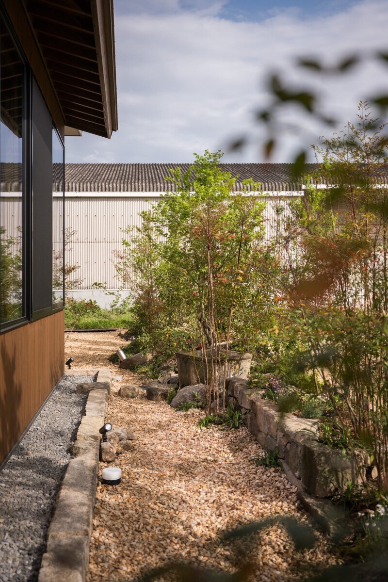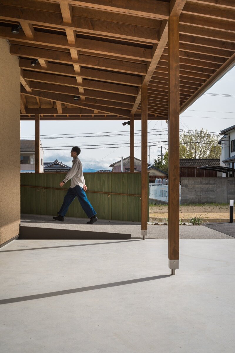 緩勾配の入り口スロープをのびやかな軒下がすっぽりと覆います。