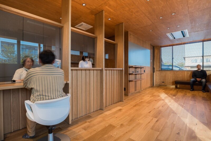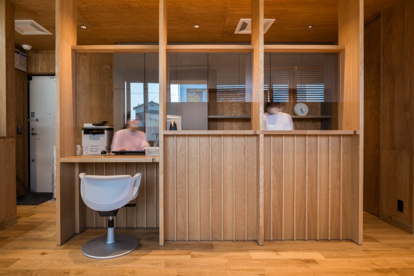 これまでの薬局は待合室も白を基調とした清潔感を重視した印象でしたが、「大学薬局さかもと」では、内装仕上げにオークの床、壁と天井はひのき合板など馴染みのある木を多用。不安な気持ちが少しでも和らぐよう安心感を重視した居心地の良い印象に。