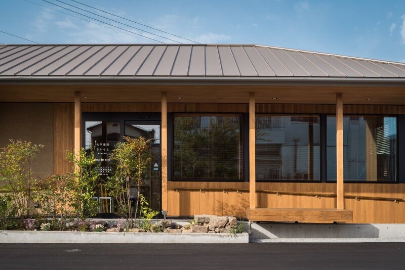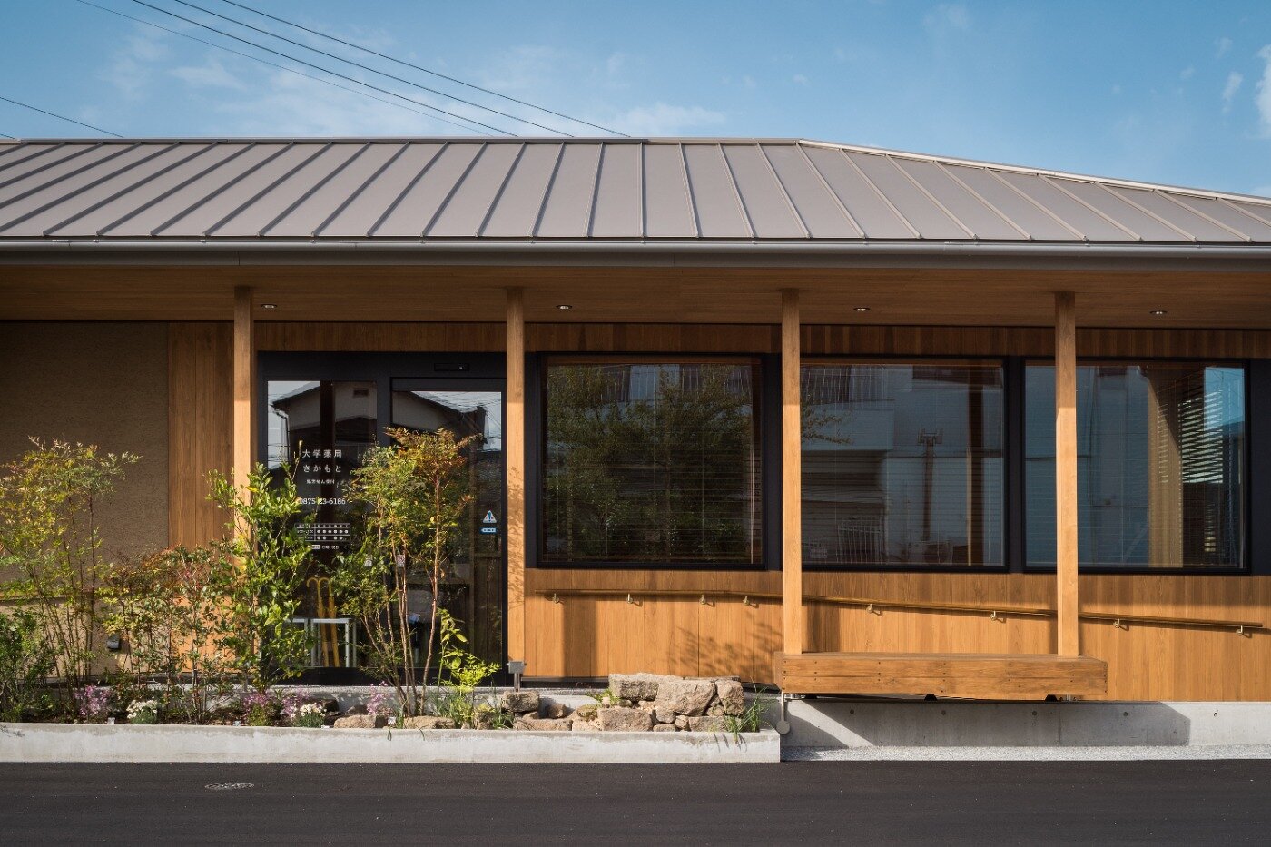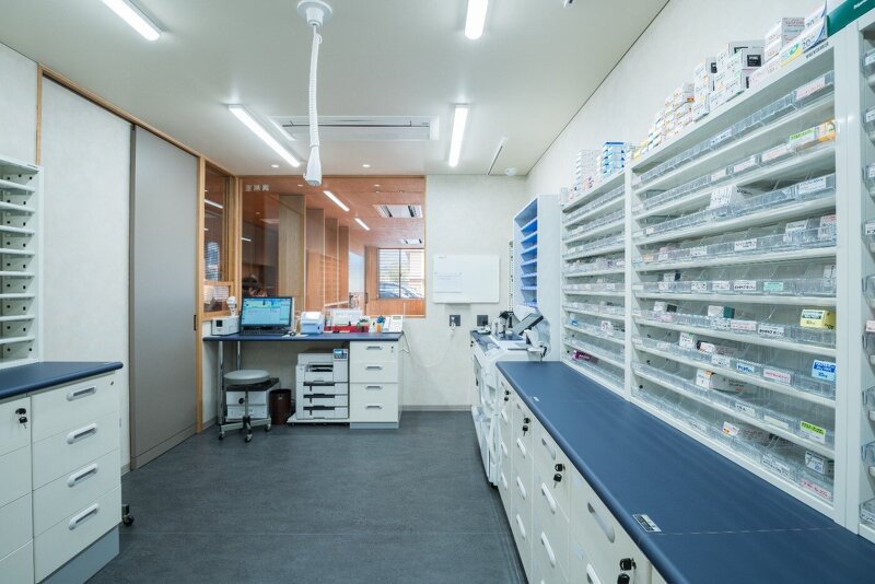 門前薬局としての機能だけではなく、近隣の医院の処方箋をお持ちの方も入りやすいように大きな窓を配置し、安心して来局出来るようになっています。外部に向けた大きな窓は自然光で満たされる空間をつくるだけでなく、外で転倒したり、困っている方をすぐに介助できるように考えられています。