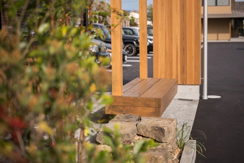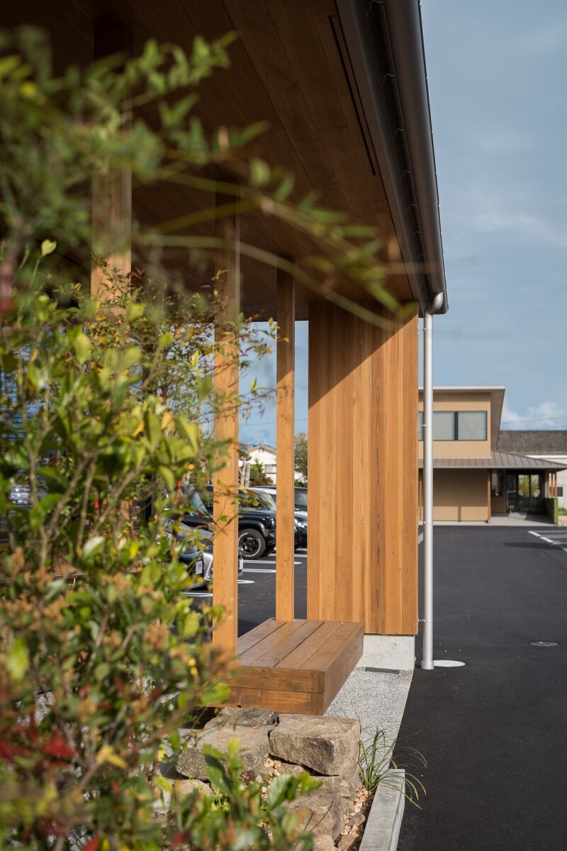 規則正しく並んだ列柱、外壁材の杉板、木の手摺など半屋外でも温かみを感じ、どんな時も包み込まれる優しさを感じさせます。