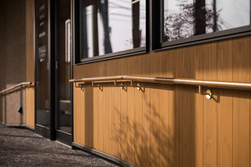 大きく張り出した軒の下は、車椅子利用者や身体的に不自由を抱えた患者さまを想定した緩勾配のスロープ、歩行者と車椅子がすれ違える幅が確保されていてどなたでも気を遣うことなく利用できます。