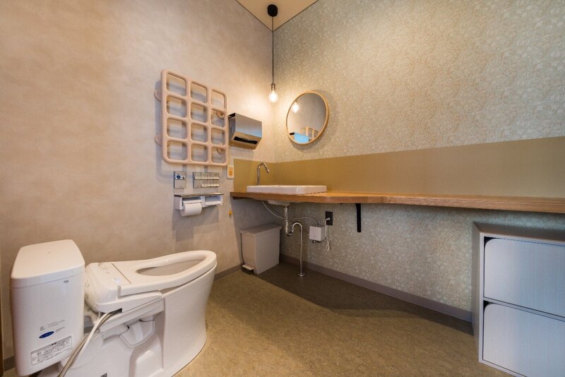 トイレはホテルライクな落ち着いた雰囲気でありつつ、車椅子利用者が一人で自立して、安全に使いやすく移乗できる設計としています。