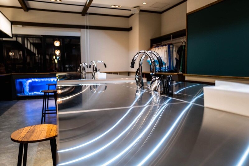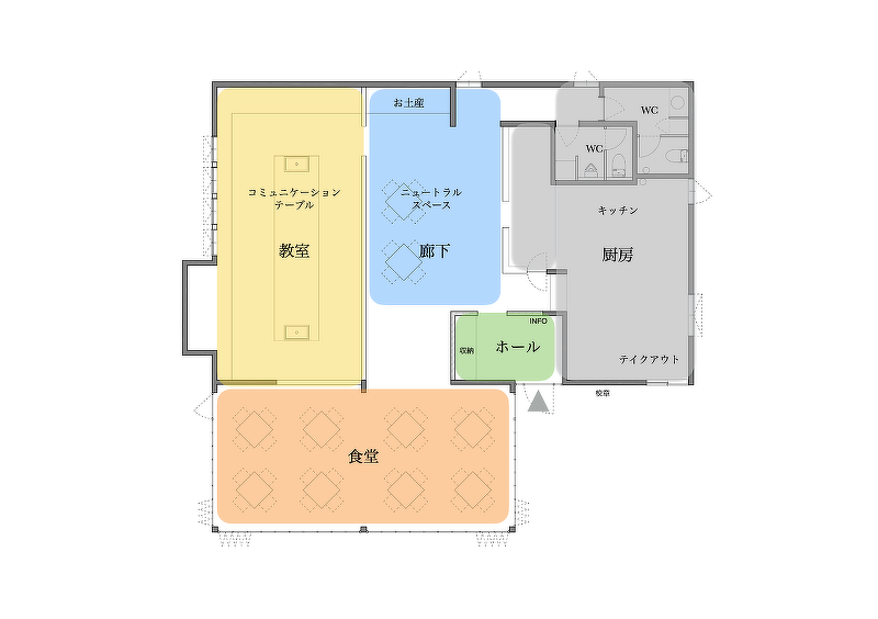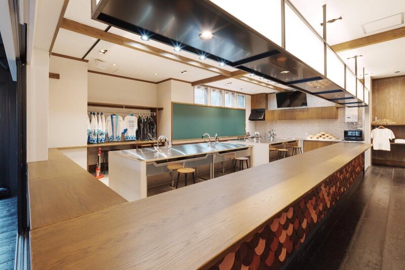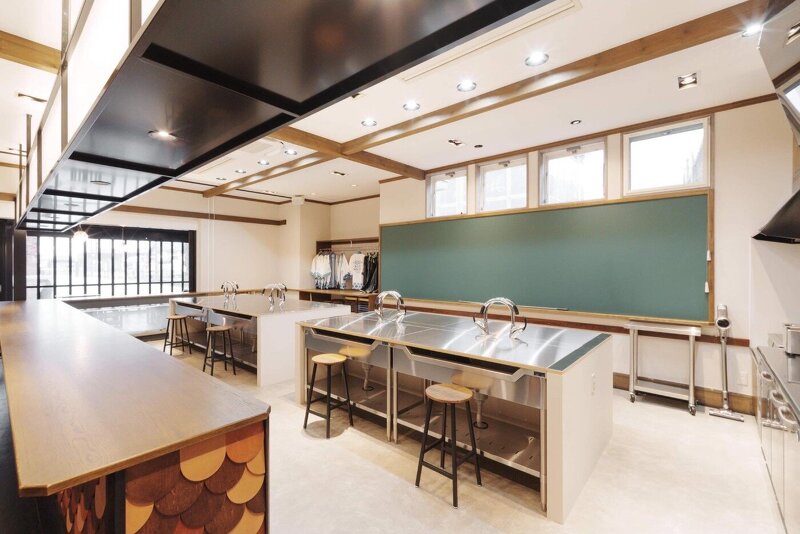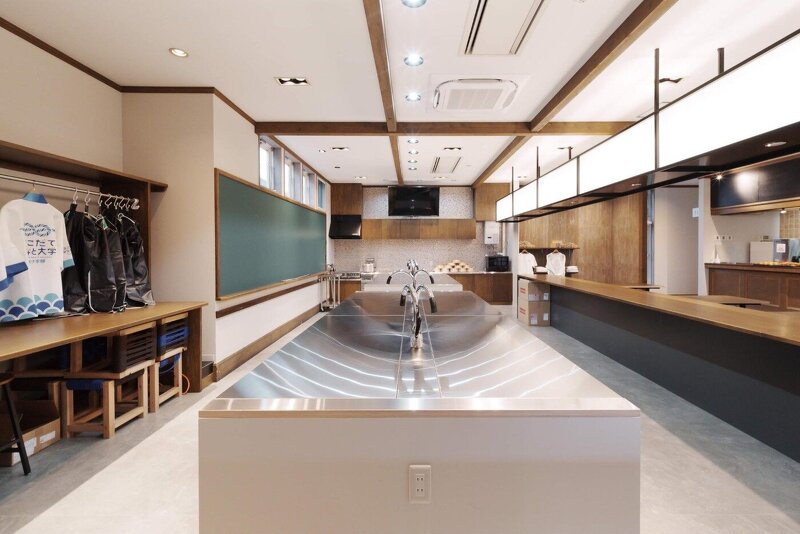 教室、廊下、食堂...。函館を体験できる学び舎は学校のようなゾーニング。作業しやすい分割された作業台は、繋げてシンクに蓋をすれば、対面型の大きなコミュニケーションテーブルになる。どこか懐かしい会話しながらみんなと学べる教室の風景を計画した。