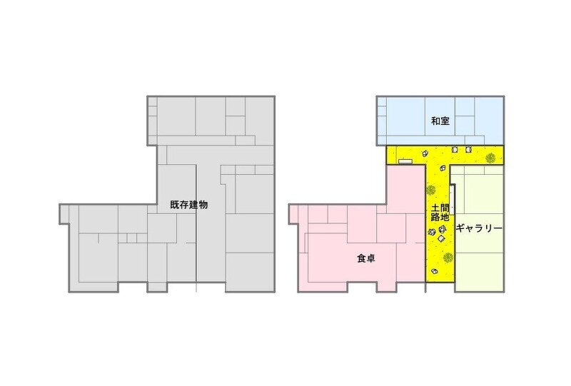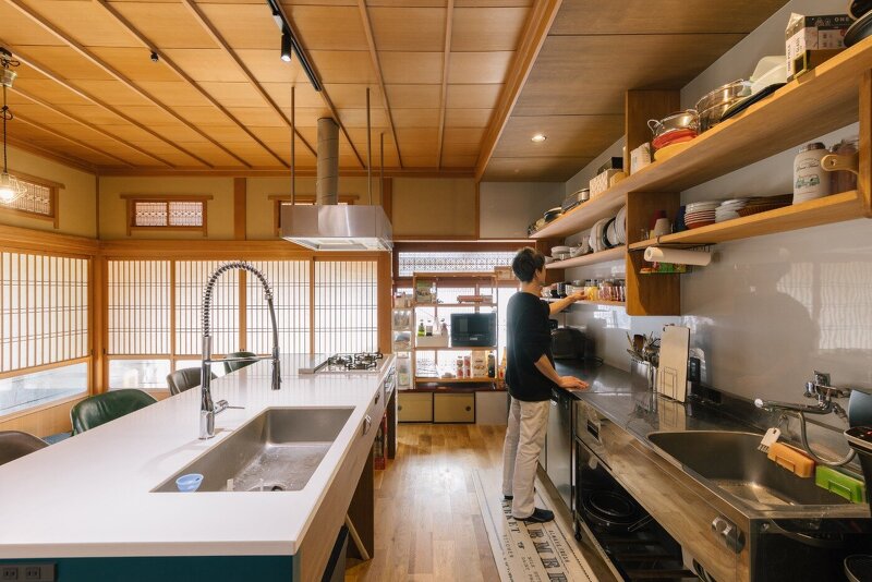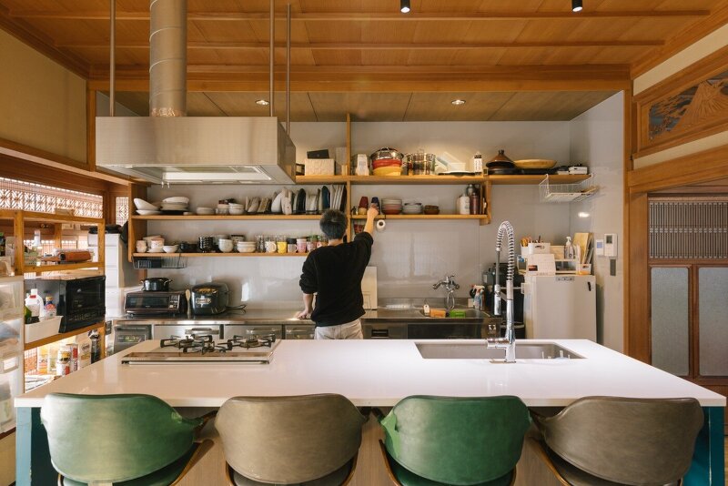 ご主人は料理人。土間路地ともうひとつ、家族みんなが一堂に集える広間がこの街家の中心にある「食堂」。みんなでごはんを食べ、ゆったりくつろげる食堂を、家族や仲間たちの寄合所としてデザイン。食堂を中心に各個室をDIYでつくっていく。まるで個人商店が並ぶ街に大家族それぞれの色が表出する。