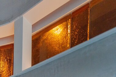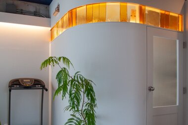 Rの間仕切り壁の上部に使用している、アンバー色のガラスブロック は、もともと玄関に嵌め込まれていたものでし