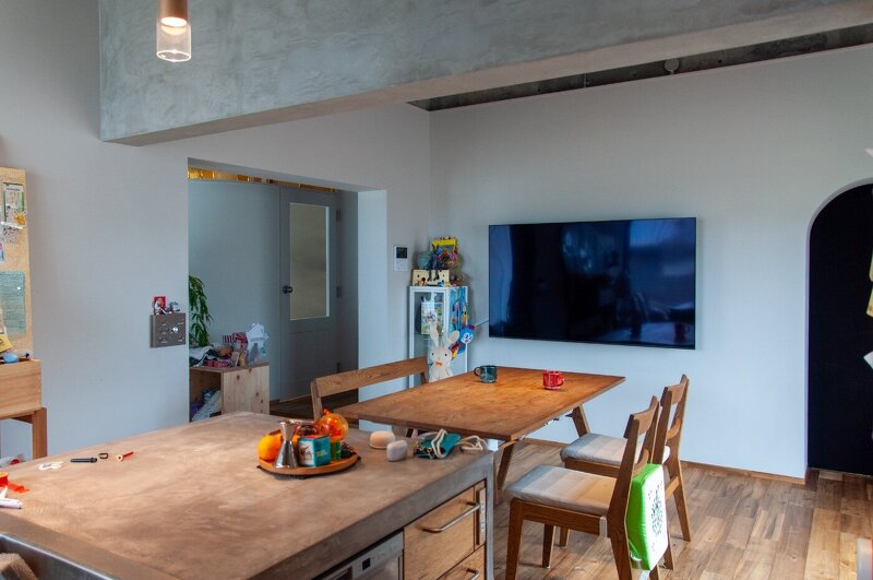 一体的になったLDKは、残された間仕切り壁や梁を逆手に取りデザイン。フレームに見立て、それぞれに夫婦の拘りを