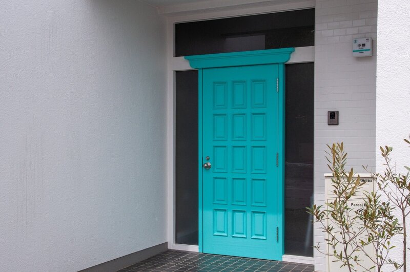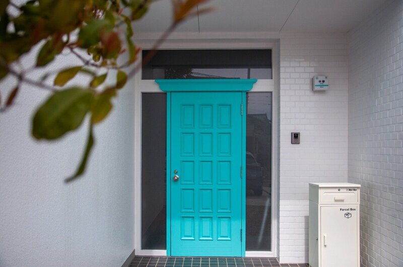 真っ白にお色直しした建物に印象的なティファニーブルーのどこでもドア。