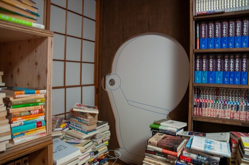本棚の一部には、ドラえもんが壁をぶち壊した設定の実物大のドラえもん型の穴。奥にはご夫婦の寝室が続きます。