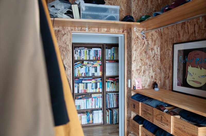 廊下の壁にある本棚と思いきや、本棚をひくとびっくり。奥には何万冊とあるご主人の蔵書が置かれた、夢のような空