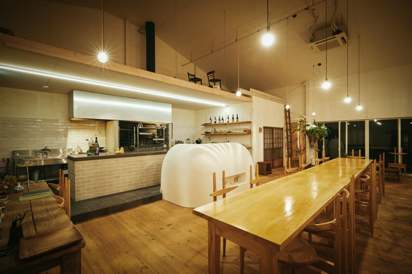 浪越氏が「美食倶楽部」に着想を得たゲストハウス構想の中で中心に据えたのは、太古から人間 が親しんできた薪を焚べて起こした炎。これまでも料理人として燧灘の海水を薪で煮詰めて塩を つくったり、cafe de flotsに置かれた薪ストーブのまわりに集まる人々の姿を通して、炎を囲む空 間に秘められた魅力が、濃密なコミュニケーションを生む重要な役割を担っていることに着目 し、薪を焚べて調理を行う「薪火グリル」と本格的な厨房設備を備えたキッチンスペースとロン グテーブルを囲む食卓スペースのある調理から食事・団欒までを楽しむ食に特化したゲストハウス を整備。施設名は「焚べる」「食べる」「しゃべる」をつなげて「ku;bel」と名付けました。