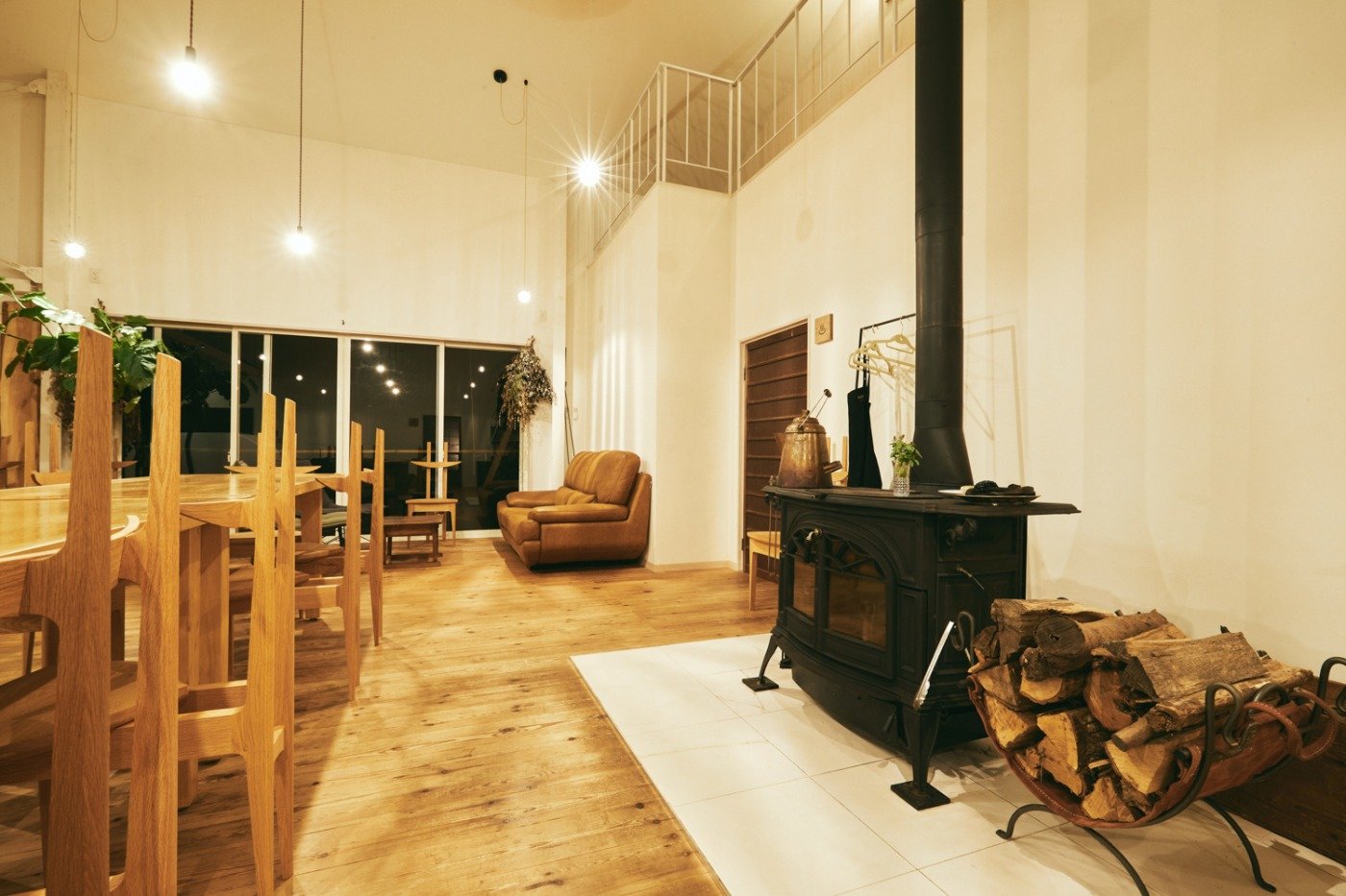 長い木製のロングテーブルが並んでいて、ゲストみんなで囲む食卓は話が弾んで、薪ストーブの暖かい火の揺らめきもあいまってドラマティックに夜が更けていきます。
