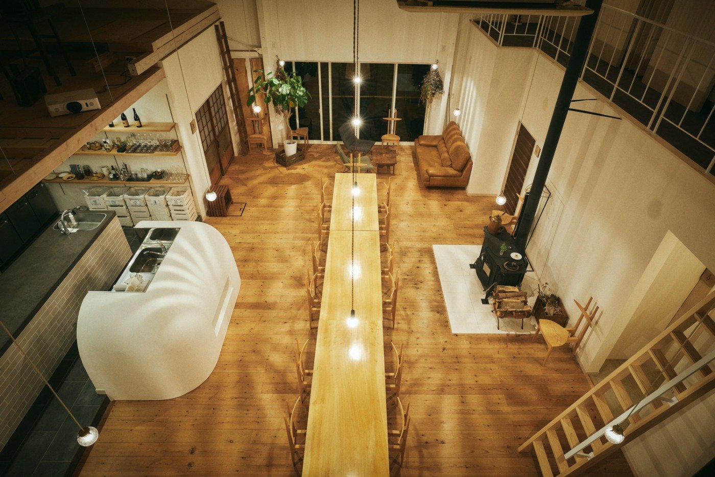 キッチンの隣は大きな吹き抜けに面したダイニングエリア。全ての宿泊室はこのダイニングを囲むようにつくられています。