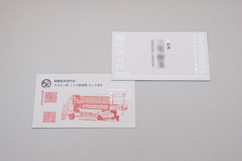 表面にはフェンス屋としての情報を、裏面にはたこ焼き店の情報を掲載。