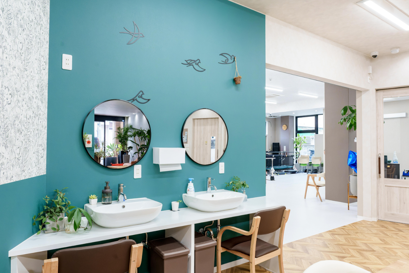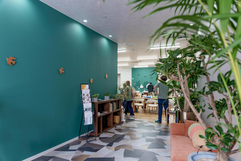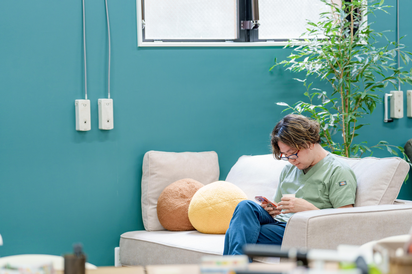 壁を斜めに配置したり、カフェのようなインテリアで利用者さんにとっては居心地よく、一般の方にとっては中に入り安くなる空間を創造しました。