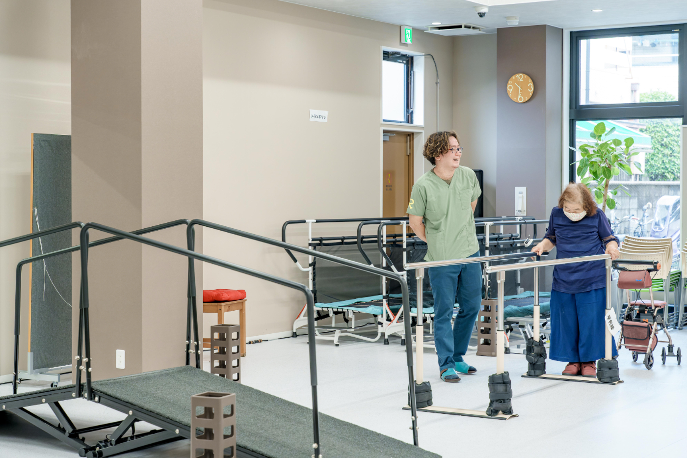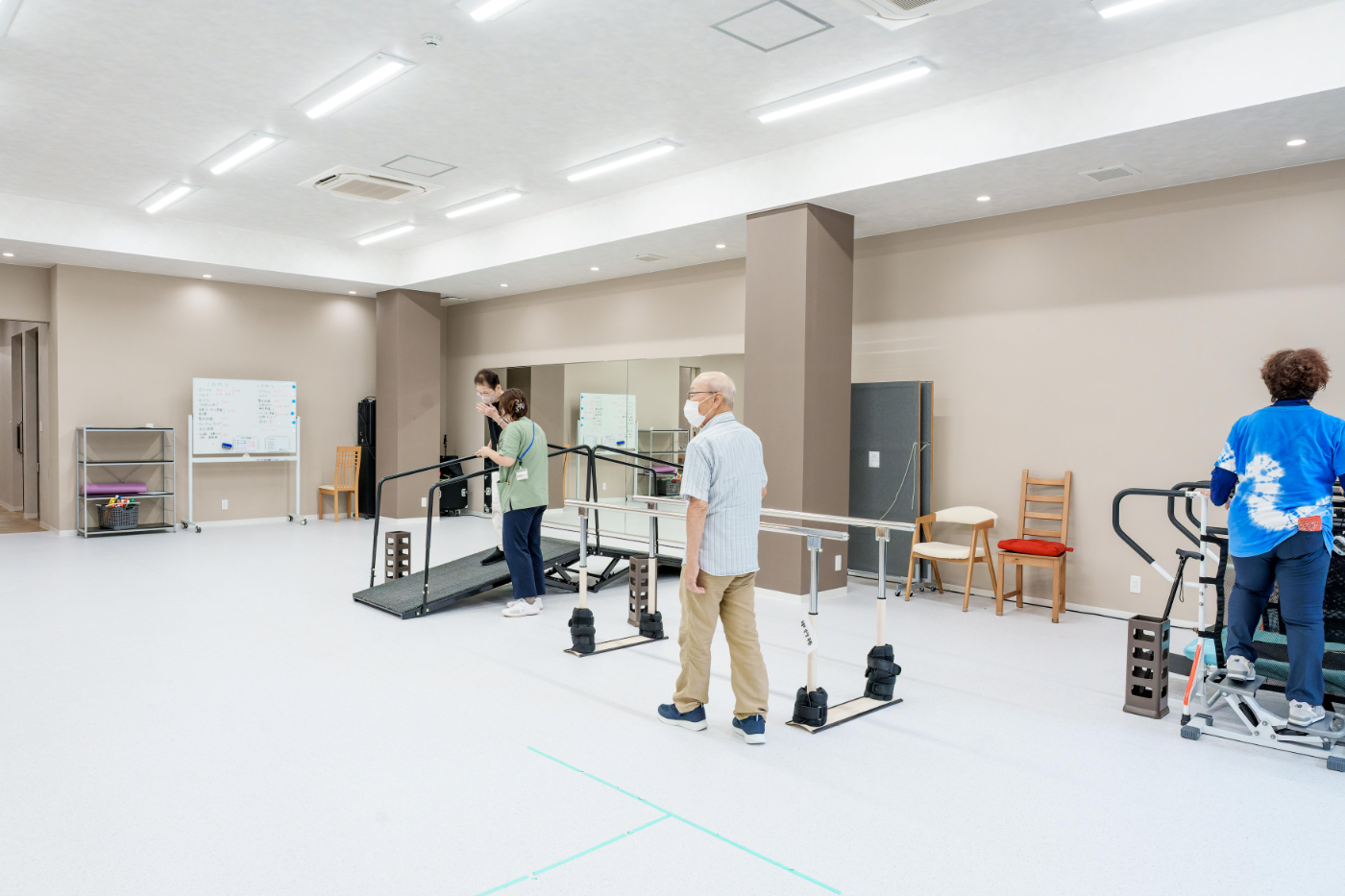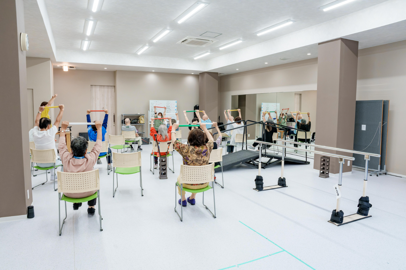 クライアントの主軸となる事業である、高齢者に向けた運動やリハビリ、そしてお風呂や食事を提供する「高齢者向けデイサービス」に加えて「ダンススタジオ」「シェアキッチン」「住民共有スペース」の4つの機能を併設し、まちに開かれた福祉をチャレンジしています。