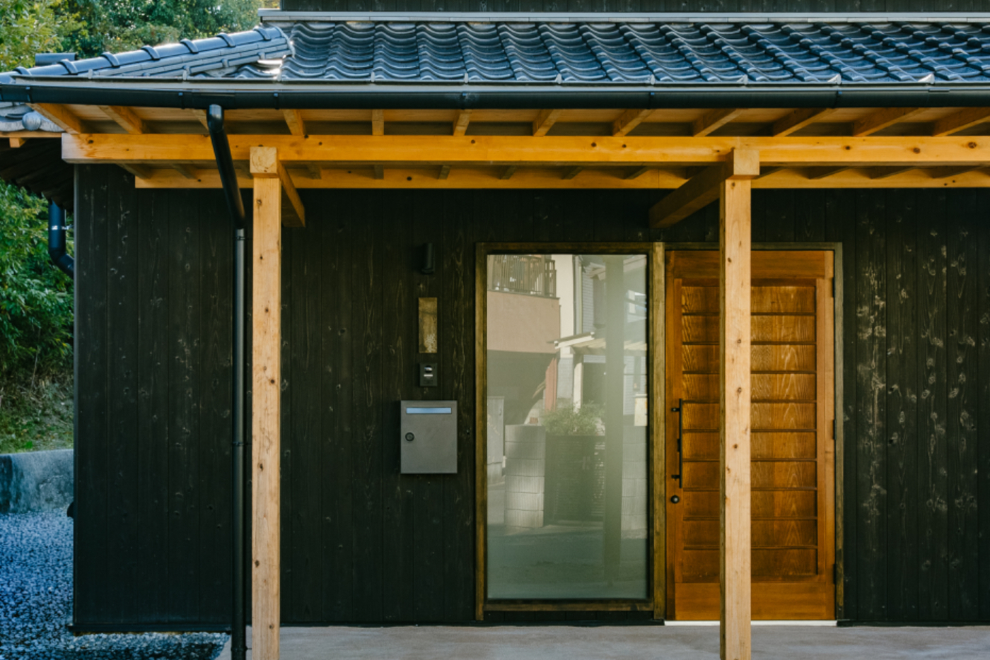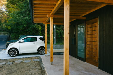 玄関に新たにつくったおおきな軒は小さな子様や荷物がたくさんあっても濡れずに住まいに入ることができ、雨の日もストレスフリーに。大きな軒の下は格好の遊び場にもなっています。