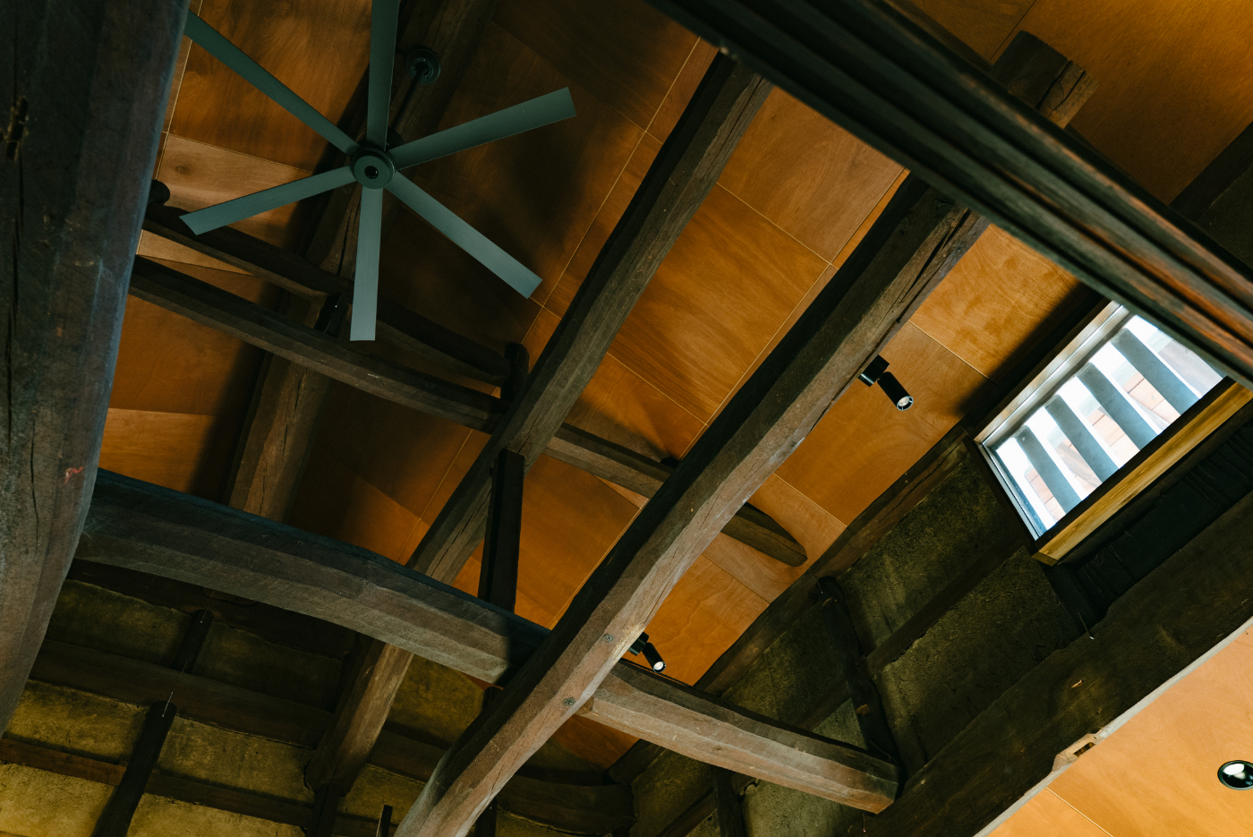中へ入ると明治時代の力強い梁組みをそのまま見せる、大胆な吹き抜けのリビング空間が広がります。