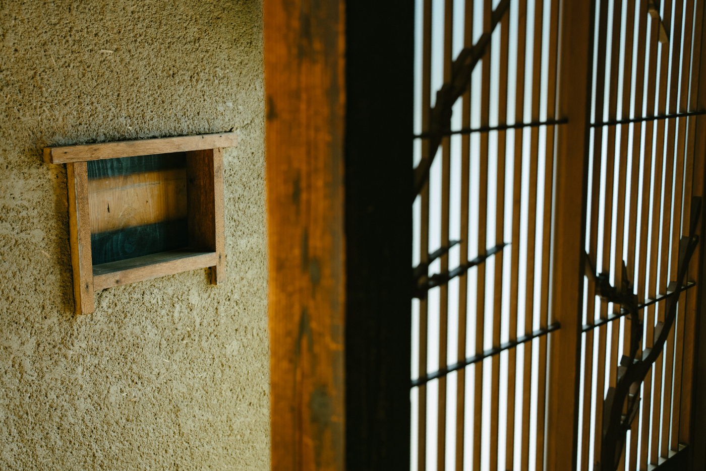 大工さんの手仕事の後の残る太い丸太梁、100年かけて変化した柱の色、粗い土壁や所々に覗く竹小舞。