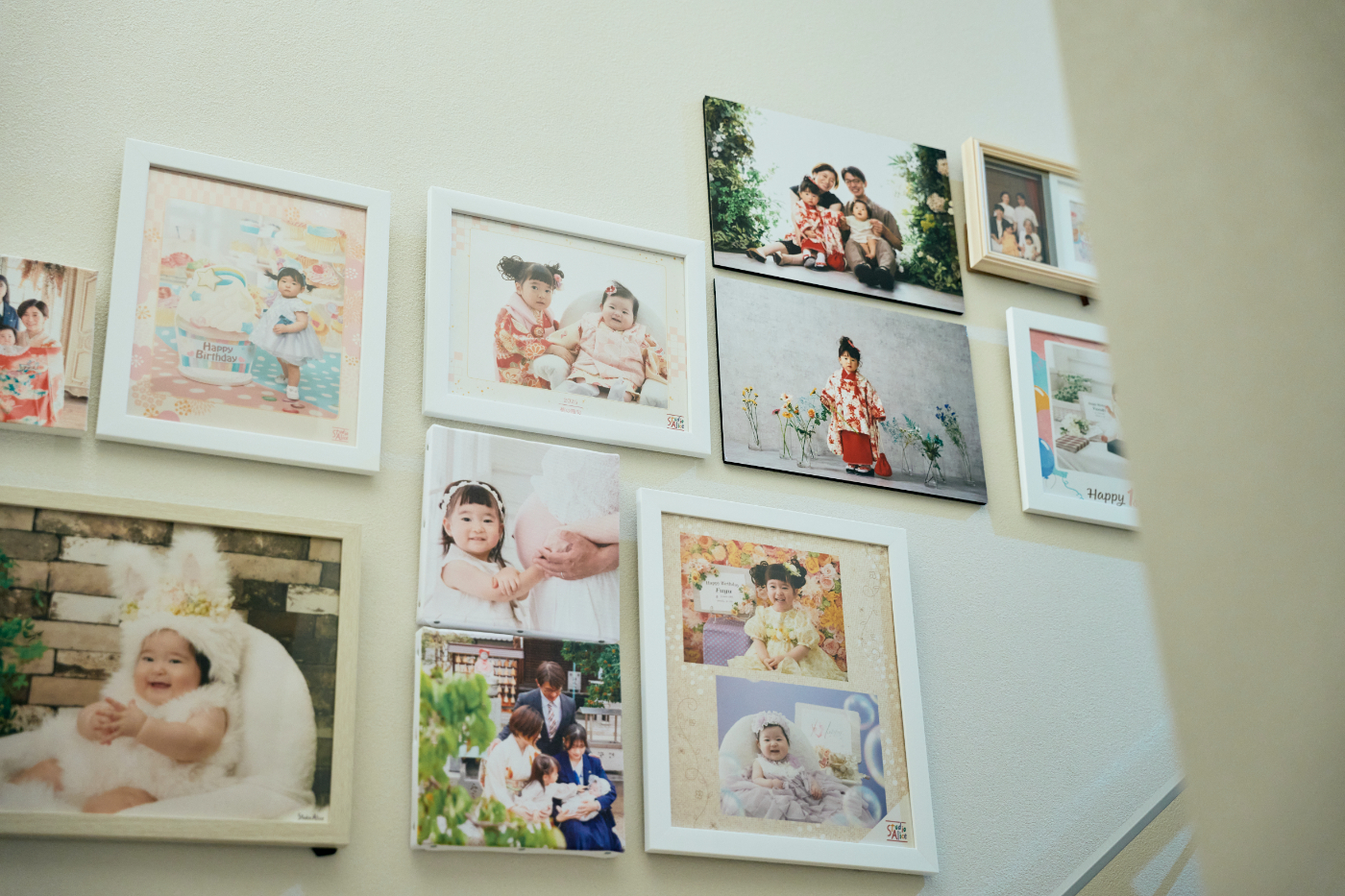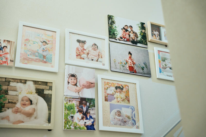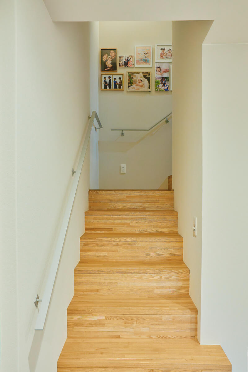 階段横の壁には、家族の写真を飾るギャラリーを設け、