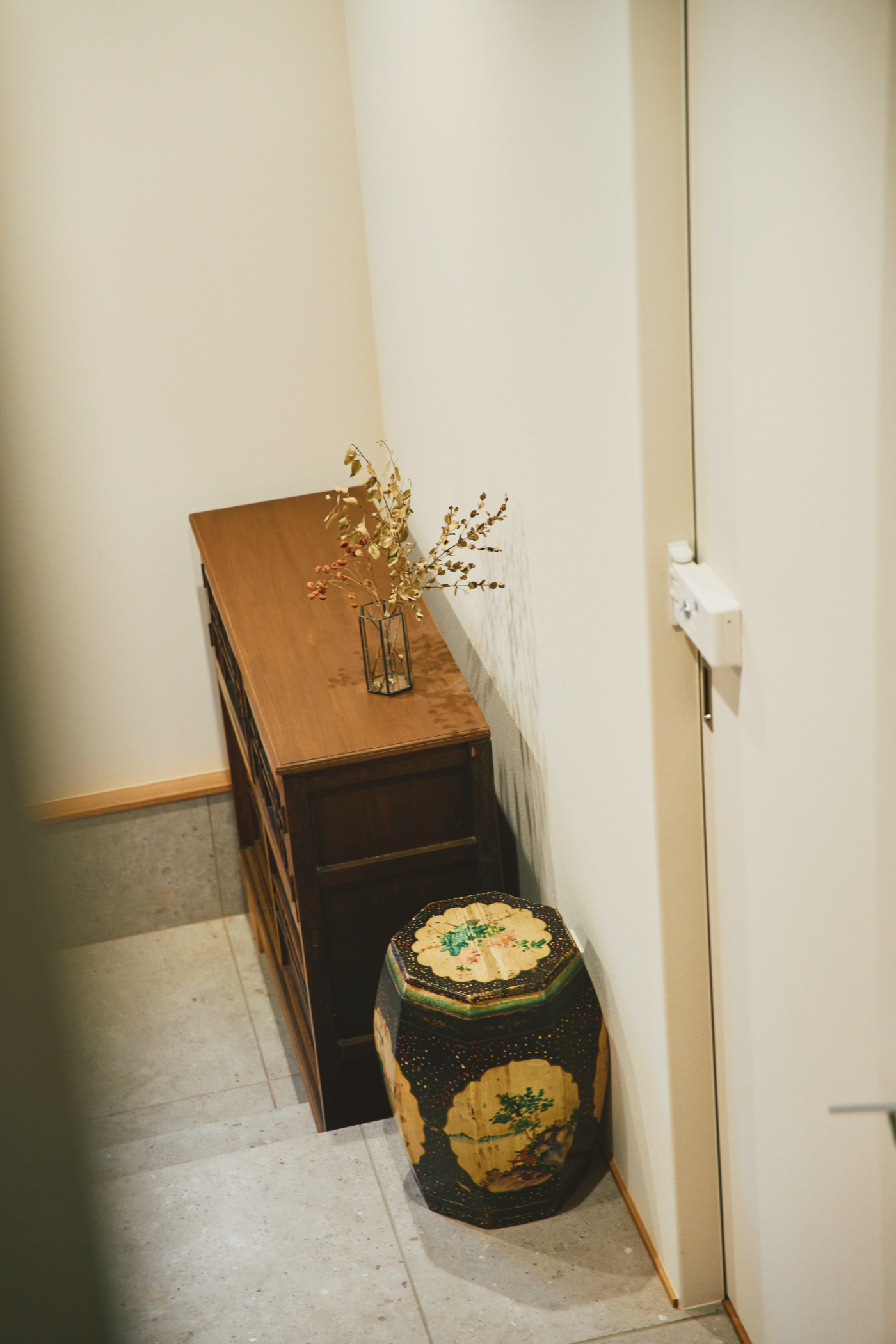 階段を上がると現れるのは、計画の軸となったアンティークキャビネットを主役としたシンボリックな空間。
