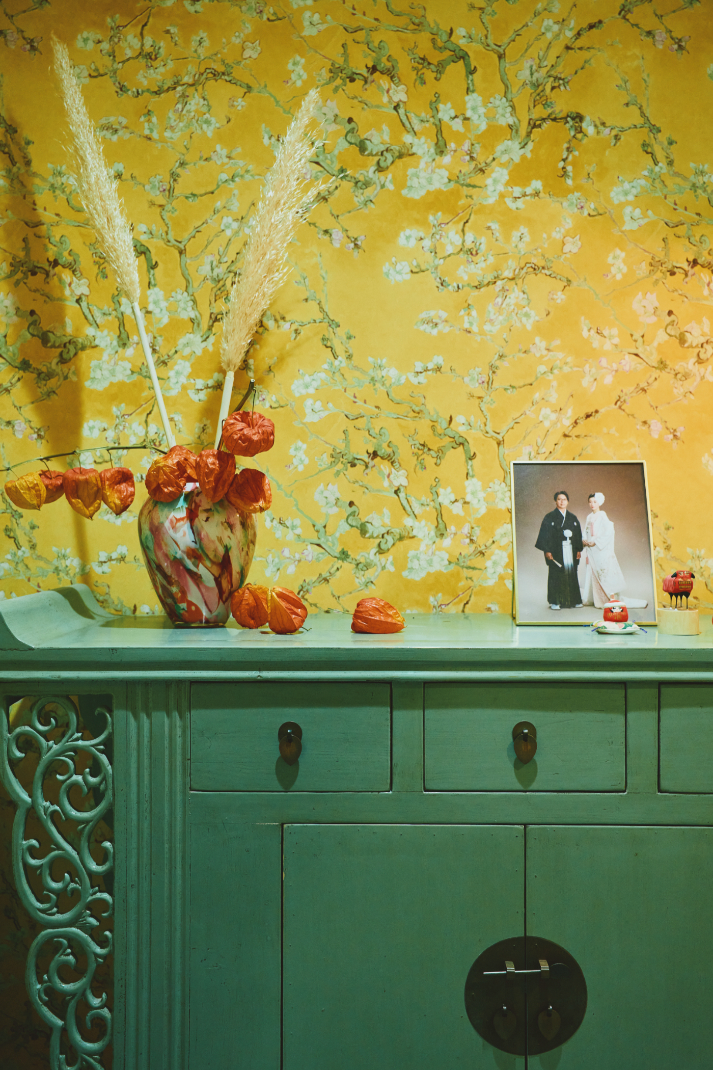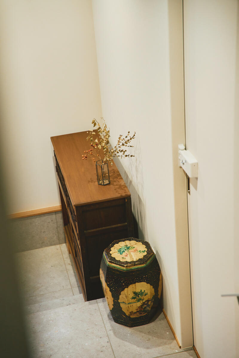 計画の起点となったのは、奥様が長く大切にされてきた中国のライムグリーンのアンティークキャビネット。