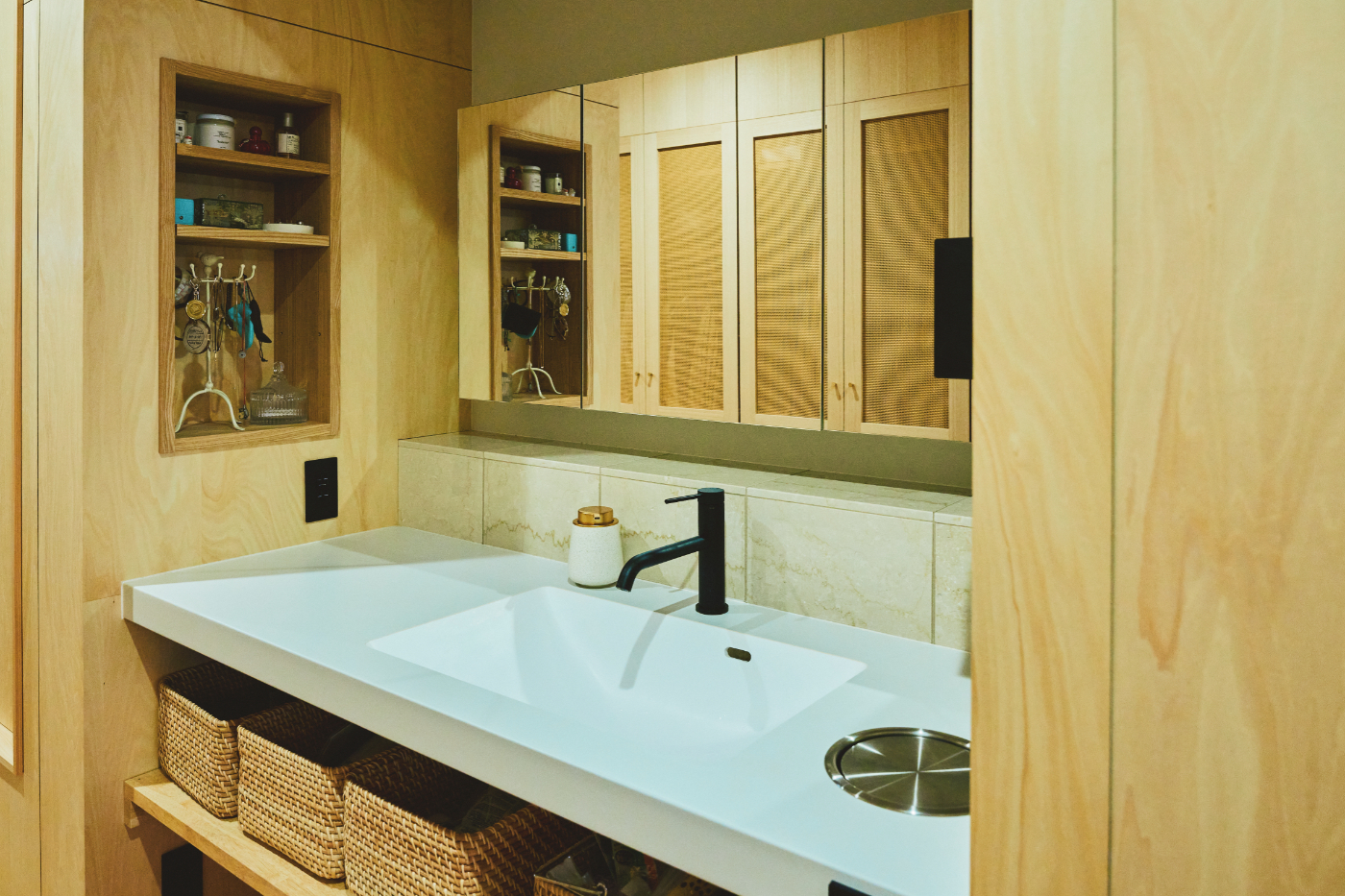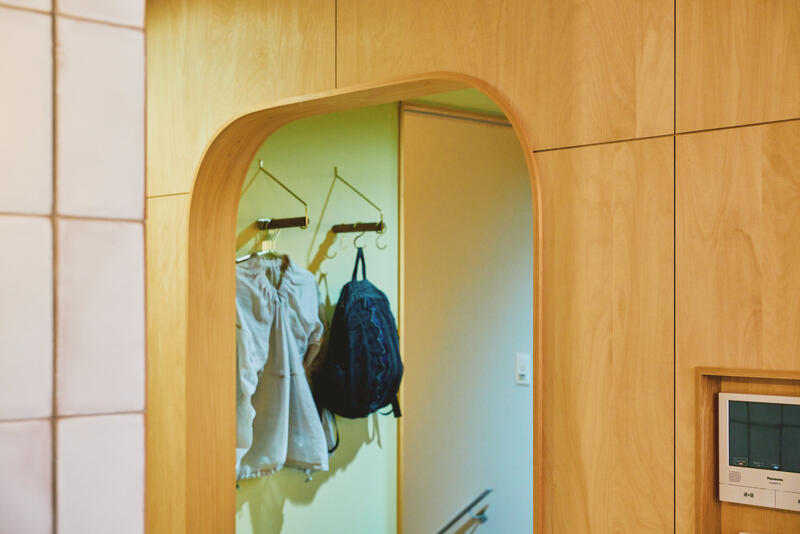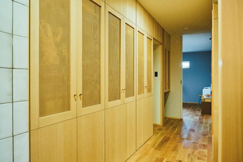 すっきりした暮らしを望む奥さんのために、機能面も細やかな工夫を施しました。エントランスから水廻りへ直行でき、近くに家族全員のクローゼットを配置。リビングの壁には必要な収納を枡の中に全て納めています。