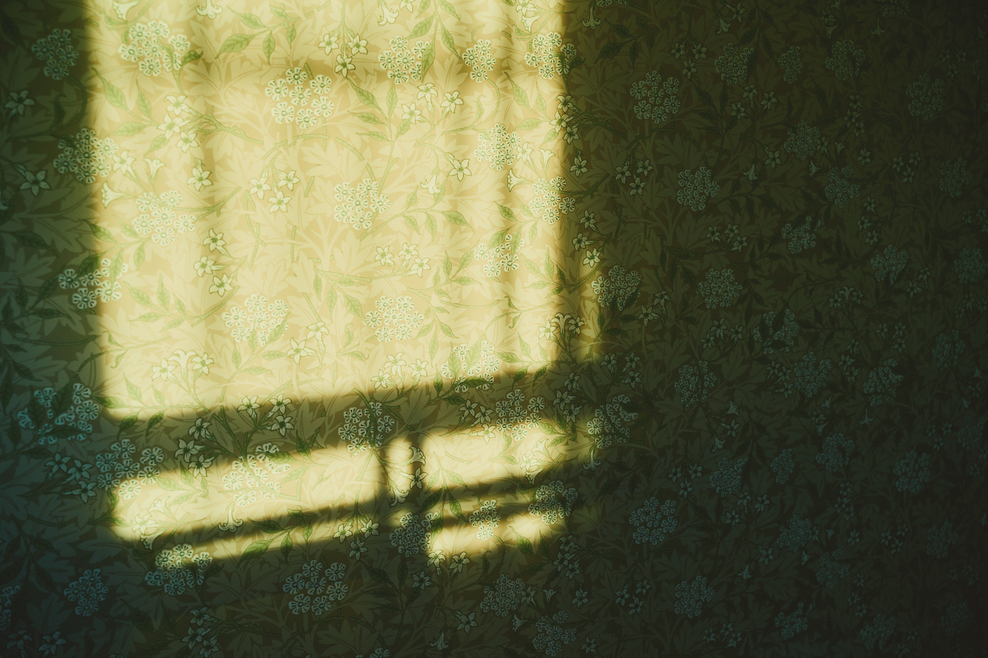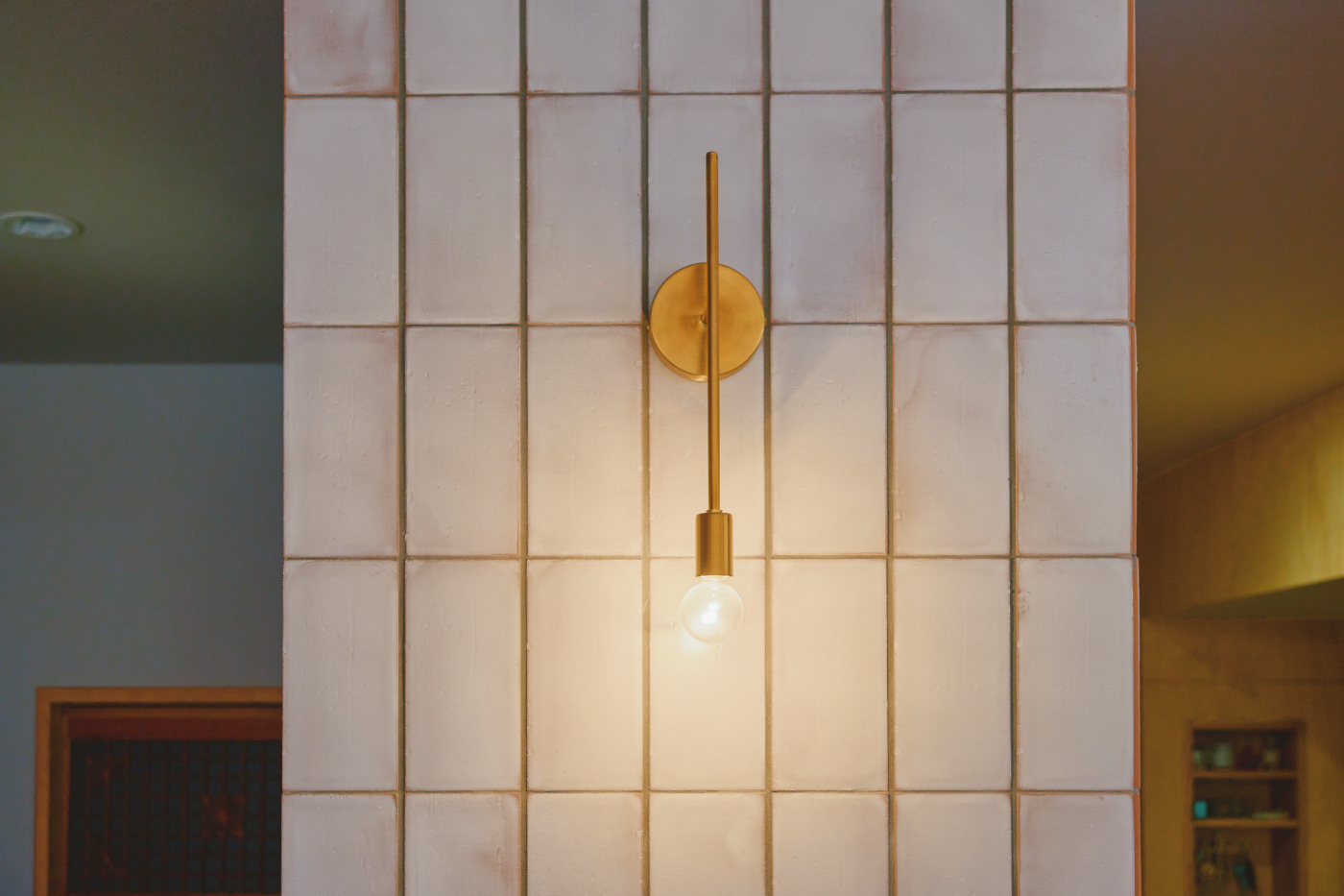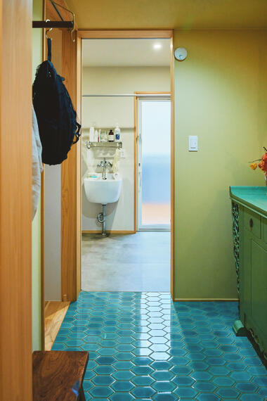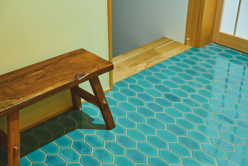 キャビネットの色に合わせた光沢のあるグリーンタイルを背に、障子越しの光が柔らかく陰影をつくります。
