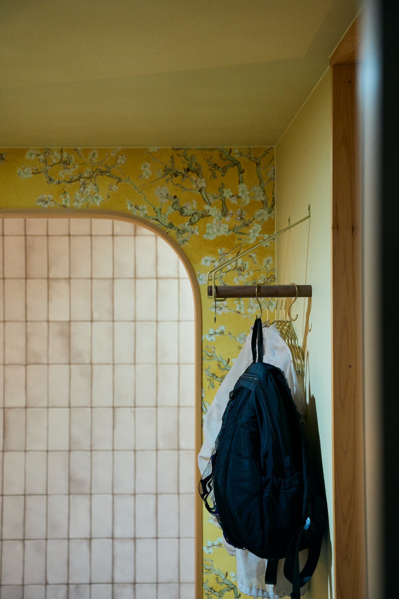 背景には日本美術を愛したゴッホの壁紙を採用し、和と異文化が心地よく交差する印象的なエントランスに仕上げました。