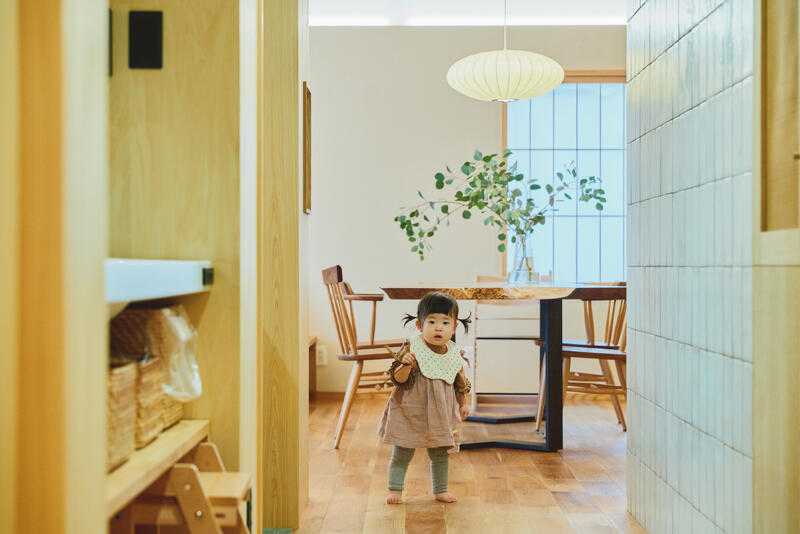 規矩術や“枡(ます)”に代表される、精緻で格式のある空間構成や意匠細部をもつ日本建築。間取りはこれに倣って、一枚屋根の下に各室の空間を機能に組み合わせ、内部のインテリアも障子やタイルなど直線を意識し空間に秩序を持たせています。枡は「増す」に通づる縁起物。広場のような開放的なLDKに家族が集い、それぞれ居心地の良い居場所で過ごせます。